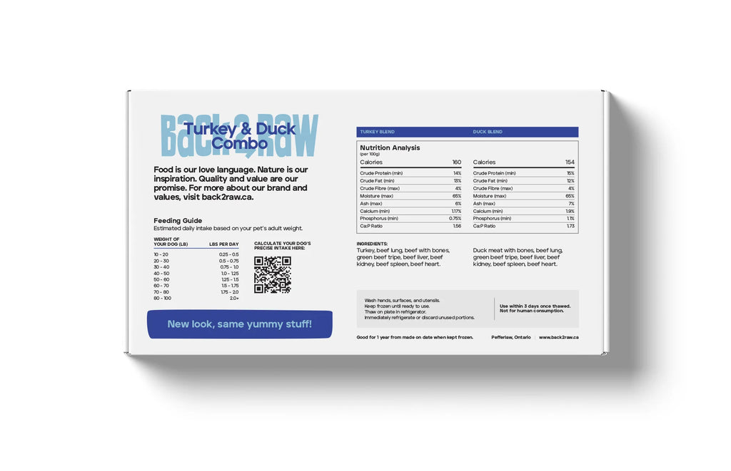 Basic formulas by Back2Raw are complete with bone, meat, organ and tripe! Basic Turkey is complete with bone, meat, organ and tripe. Basic Duck Beef is complete with bone, meat, organ and tripe as well.