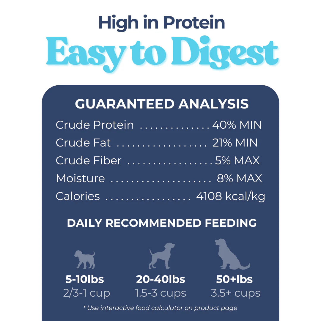 Turkey with Ground Bone, Turkey Liver, Turkey Gizzard, Turkey Heart, Cultured Yeast, Inulin, Chicory Root, Dandelion, Carrots, Pumpkin, Apples, Broccoli, Blueberry, Flaxseed, Banana, Squash, Parsley, Egg, Organic Kelp, Herring Oil, Turmeric, Mixed Tocopherols (natural preservative), Tomato, Shiitake Mushroom, Orange, Cranberry, Spinach, Beet, Tart Cherry, Strawberry, Vitamin E Supplement.