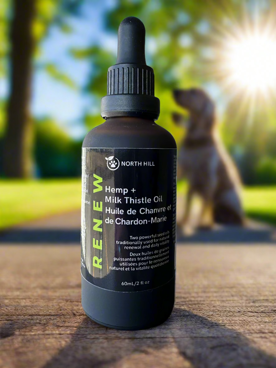 Renew - Hemp + Milk Thistle Oil combines two potent seed oils known for their traditional benefits in supporting dogs health renewal and daily vitality. Hemp oil provides essential fatty acids that promote skin health and overall wellness, while milk thistle oil supports liver function and detoxification. Together, they offer a natural, expert-formulated complement to your dogs ’s daily care routine, helping maintain their energy and well-being over time.