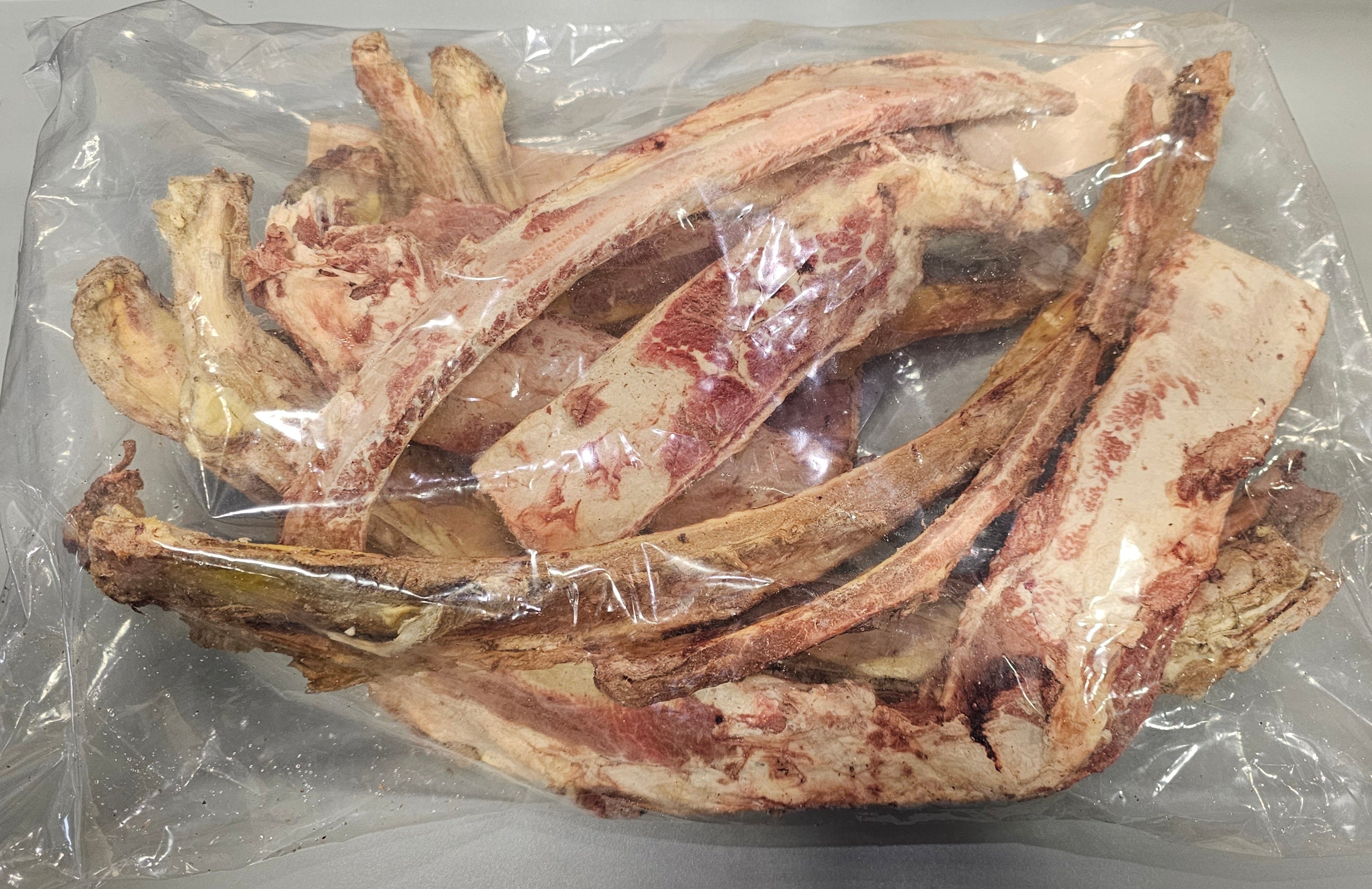 5 LB bag of mid-sized, weird looking Beef Rib bones. These 5 LB bags of rib bones are a mix of small, mid size, and large oddly shaped ribs. The odd colour of the fat on these ribs is because they are sourced from from grass fed beef. The yellow hue is due to beta-carotene; a pigment found in grass and other legumes, which is stored in fat.